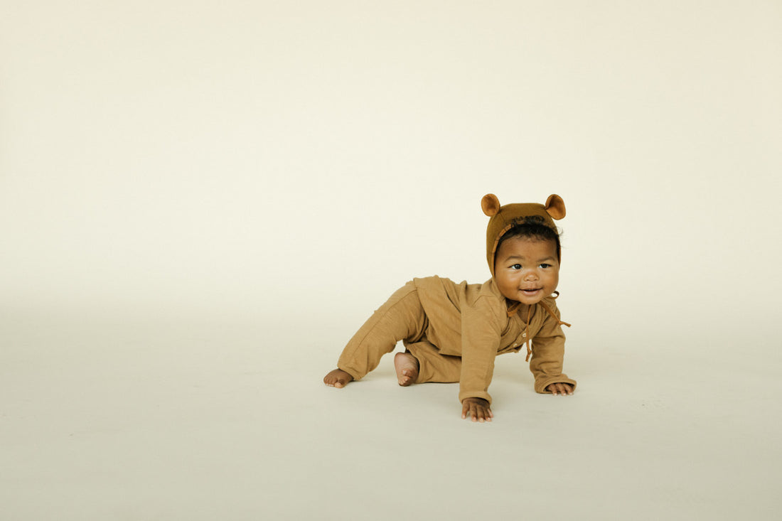 Let's start with an accessory that is literally too cute for me to handle, and will be the perfect thing to dress up your babe in on Halloween night! No muss, no fuss, the Briar Handmade Animal Bonnet - Honey Bear is the most adorable add on to anything and voila! You've got a costume. Dress it up with a tail and a little nose, or keep it simple for your tiny babes with a brown onesie and you're set!