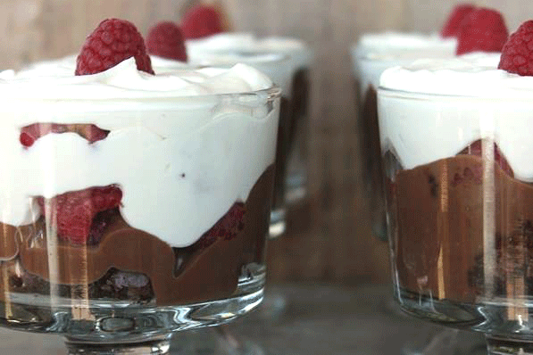 Assembly directions: Fit a layer of brownie squares in bottom of trifle glasses. Top with a thick layer of custard, a third of the whipped cream and a third of the raspberries. Repeat layering until all ingredients have been used. Serve immediately, or cover with plastic wrap and chill for up to 24 hours before serving. Top with additional raspberries or shaved chocolate.