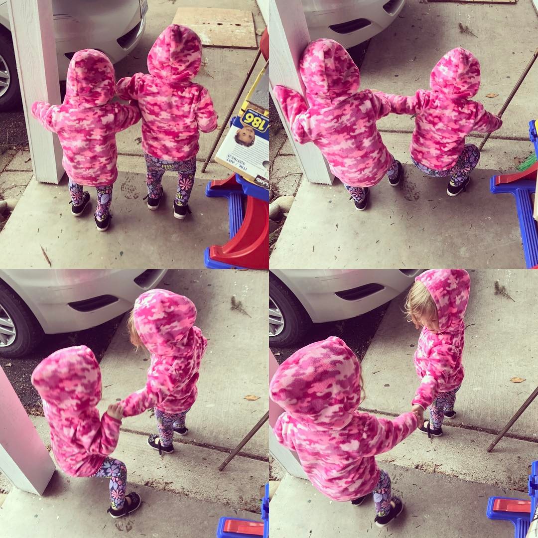 If one of my twins is still sleeping, and the awake twin just misses her twin too much, she runs to her room, and tries to push the door open. If she succeeds (aka I didn't latch it all the way when I got the one twin up), she runs in and tries to wake her twin up. This is NOT so heart-melting to mama. ha.