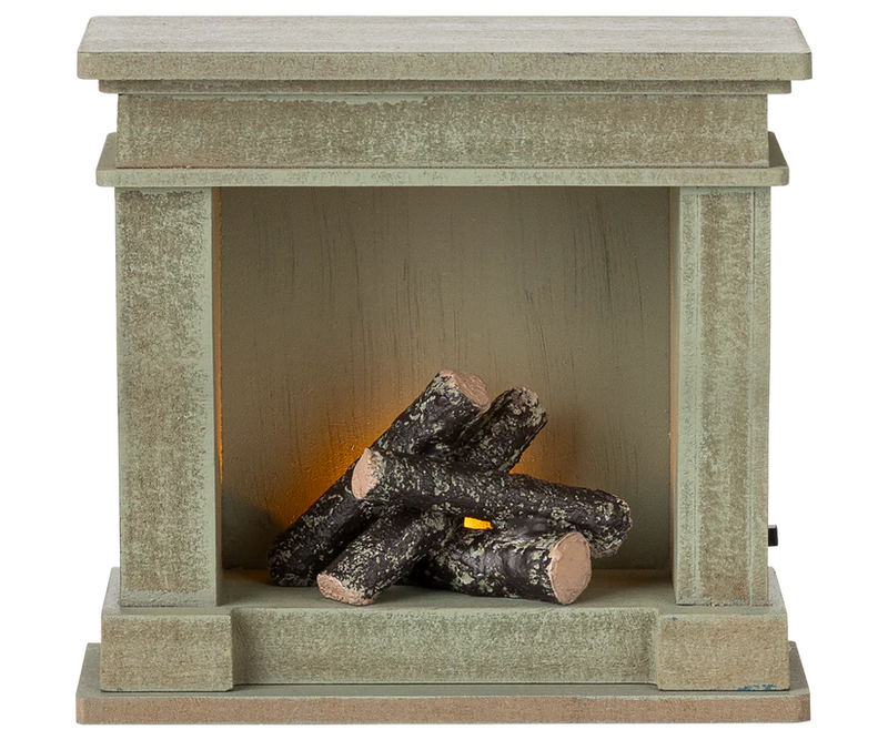 Cozy nights call for a warm glow! This wooden fireplace adds charm and character to your Maileg mouse house, complete with a vintage finish and authentic design. Just pop in a coin cell battery (CR2032) to bring the light to life.