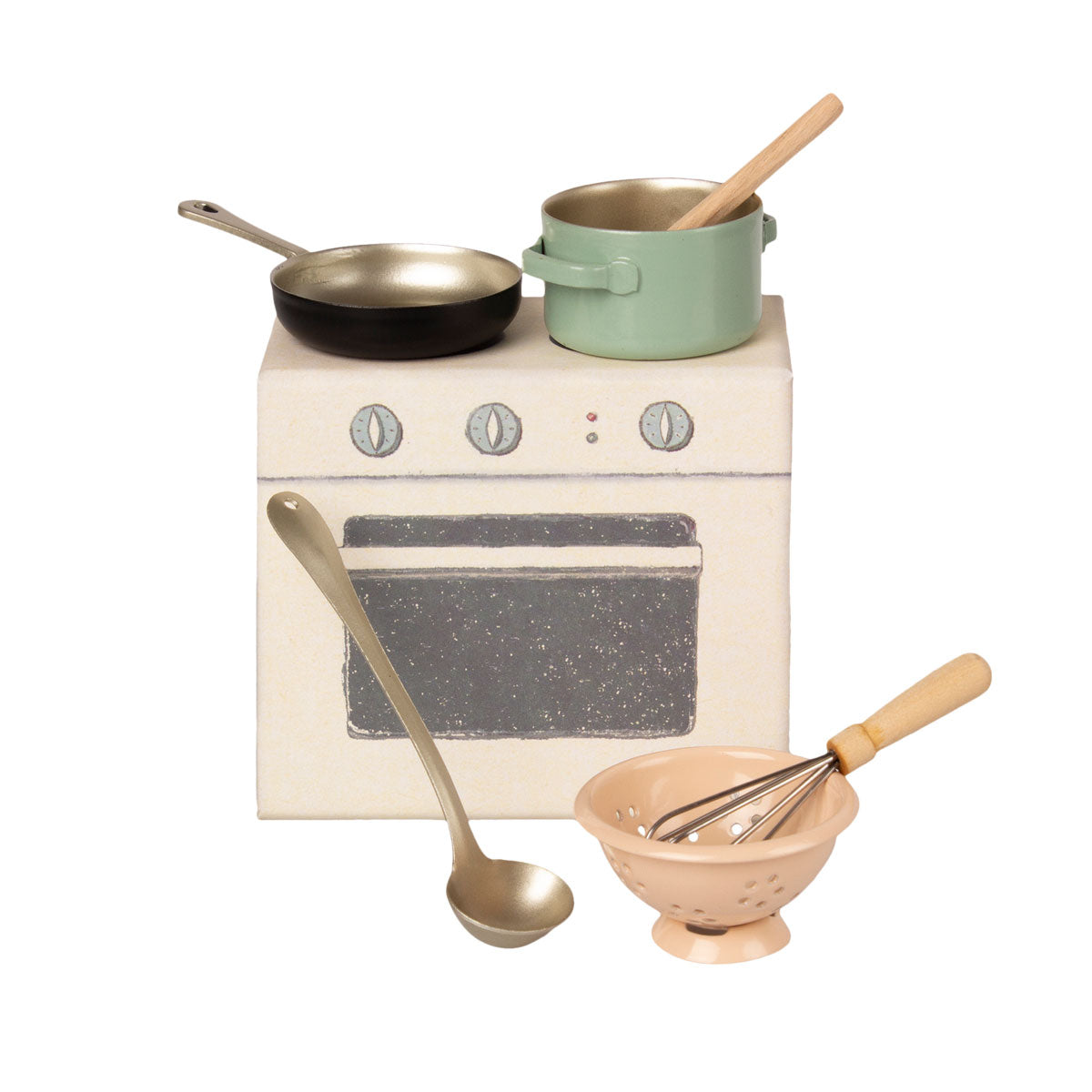 The playful stove box opens up to reveal everything you need to cook a perfect imaginary dinner. The set includes a pot, pan, strainer, and utensils.