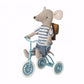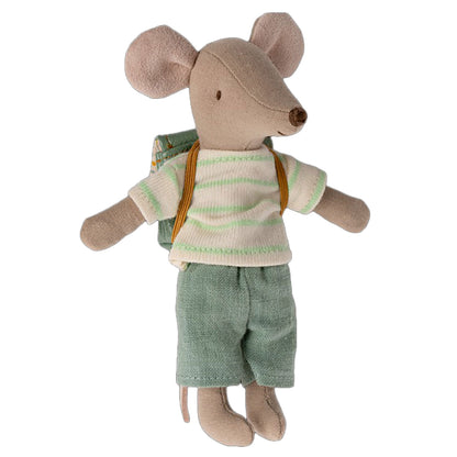 Big brother mouse is dressed for a day at school, carrying his backpack along with him. He has magnets in his hands so he can hold the handles of the Maileg Tricycle (sold separately) when he rides quickly home from school.