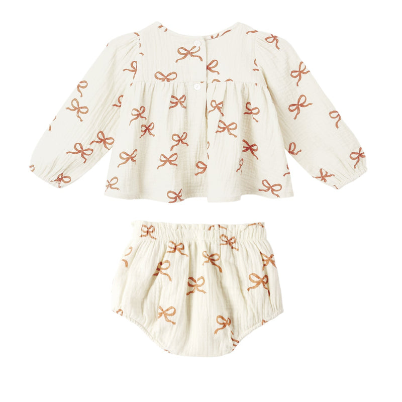 Sweet and timeless, this two-piece set features a gathered blouse with balloon sleeves, button backing, and matching bloomers with a ruffled waist. Finished in Rylee + Cru’s ruby bows print on a natural hue for a charming seasonal look. Care: Machine wash cold. Tumble dry low. Made of 100% Cotton.