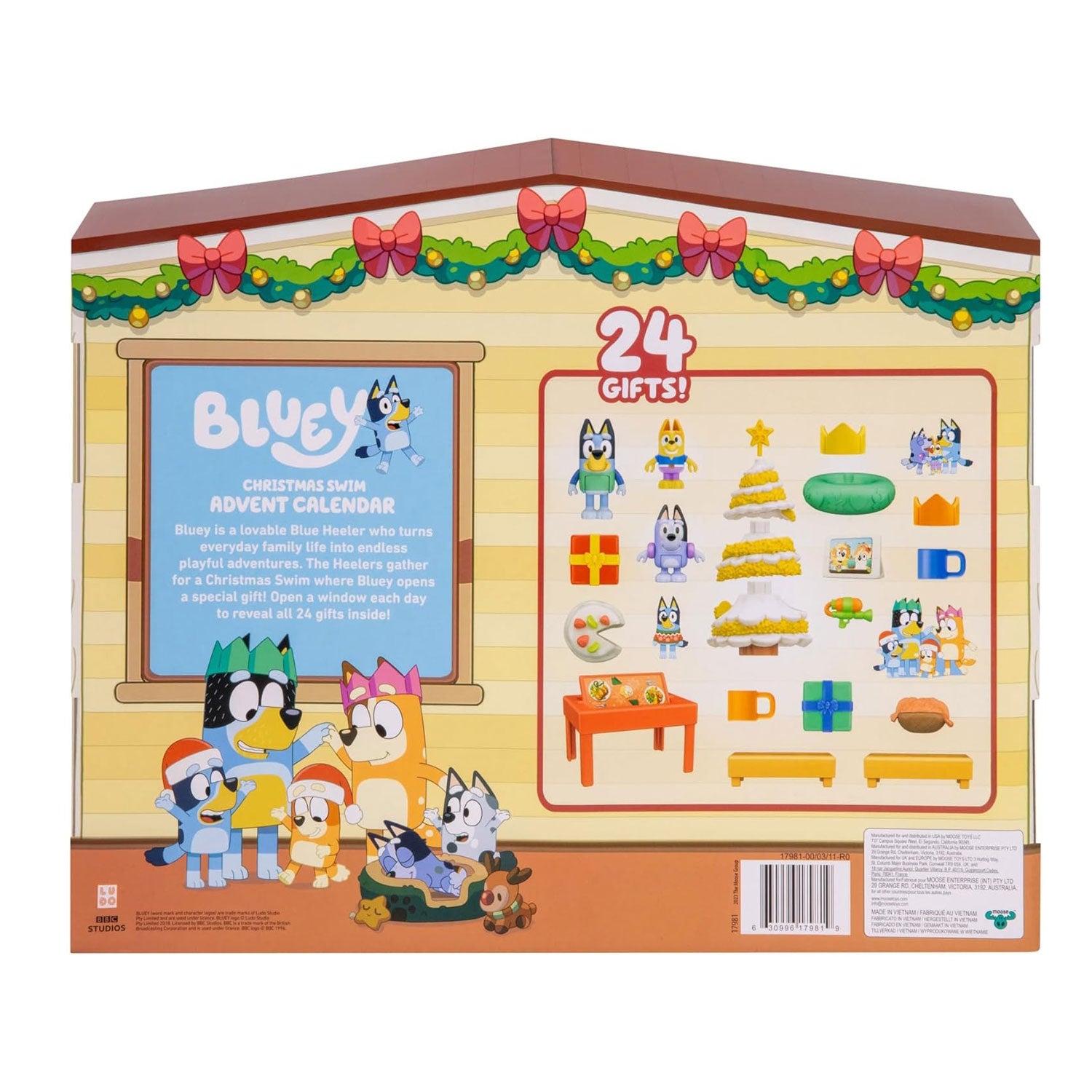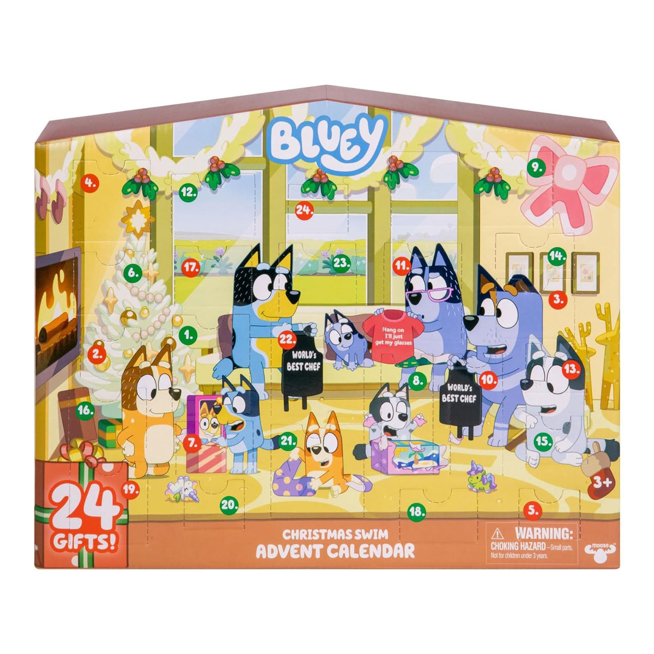 Count down the days till Christmas with the Heelers and Bluey's Christmas Swim Advent Calendar! This very festive Bluey surprise pack has 24 surprises hidden behind 24 different windows. Open up a window each day till Christmas day and discover all sorts of fun Bluey themed items to help celebrate the season. Find the Bluey and Socks figures, all ready for a dip in the pool! There are also 19 other accessories, 3 stickers, and a Christmas tree to put together! Get excited for Christmas day throughout the month of December with the Bluey Advent Calendar!