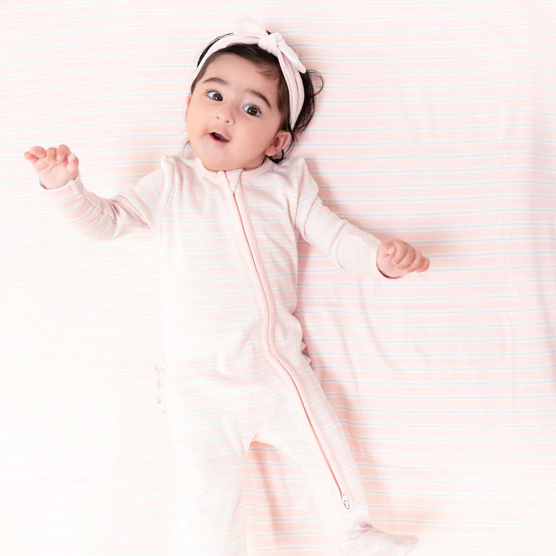 Pretty in pink (with a playful twist), this ruffle back footie is equal parts cozy and charming. Soft ribbed modal fabric, thoughtful details, and sweet stripes make it a must-have for snuggles and everyday adventures.