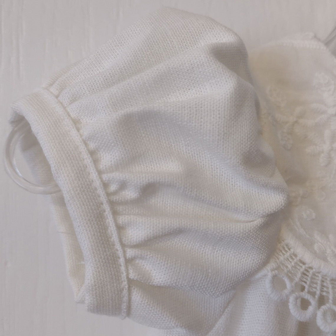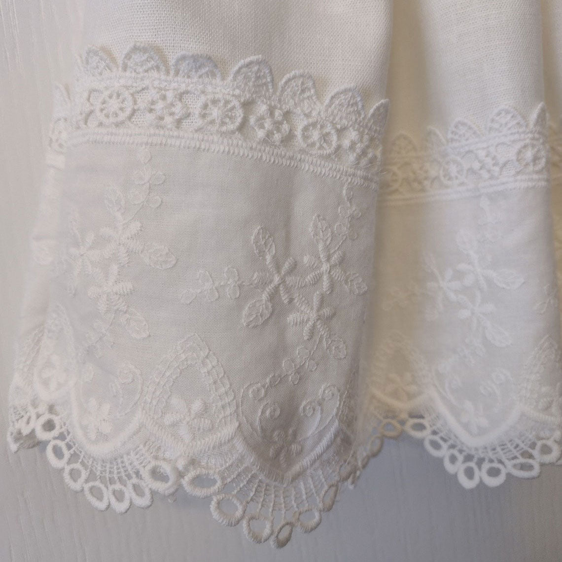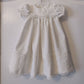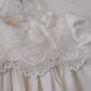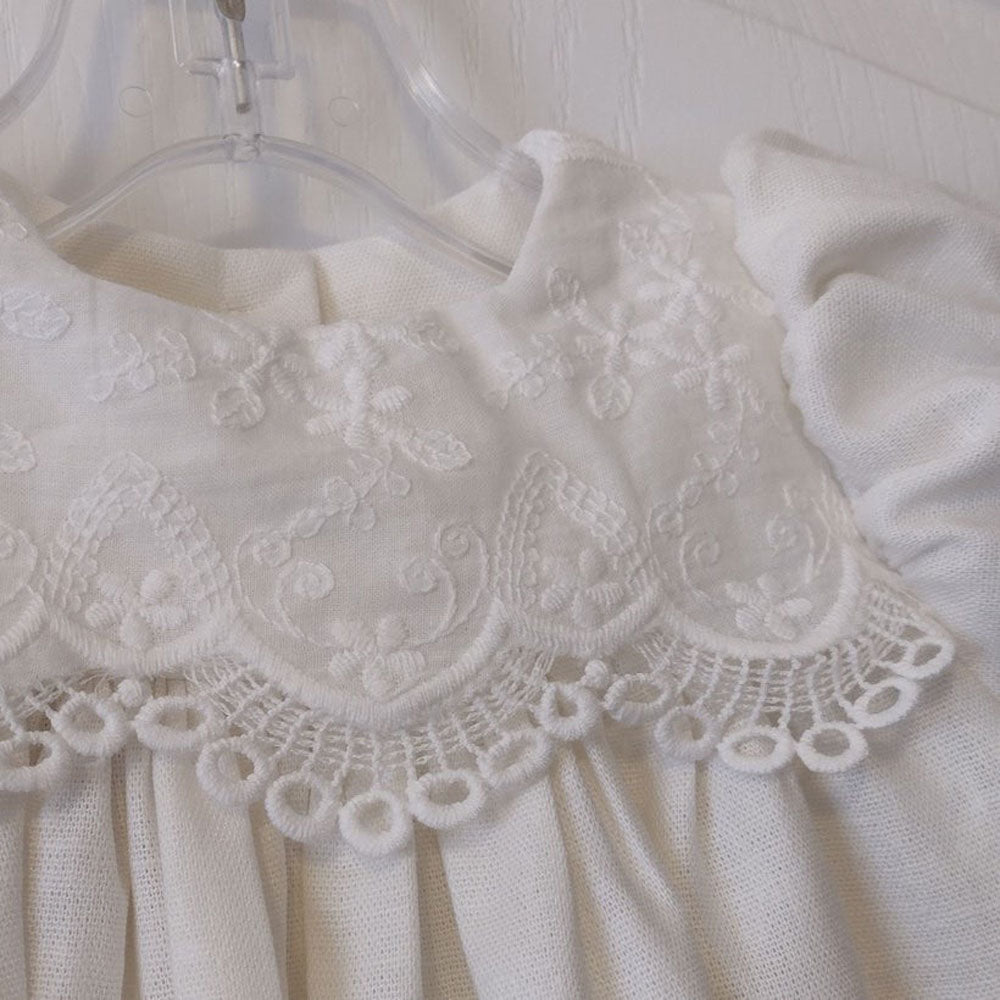 Eden is made with a milk white linen/cotton blend fabric. The high yoke style is covered in beautiful embroidered milk white cotton lace. The same lace trims the bottom of the skirt for a cohesive, elegant look. The perfect dress for christenings, baptisms, or baby blessings!