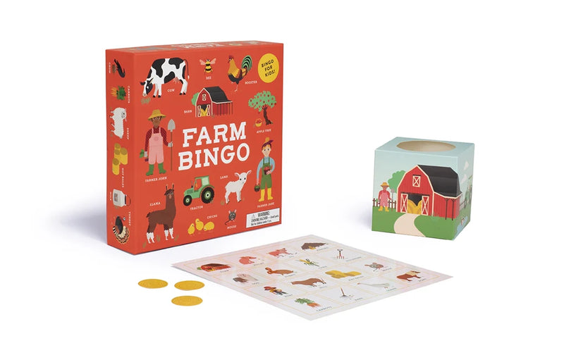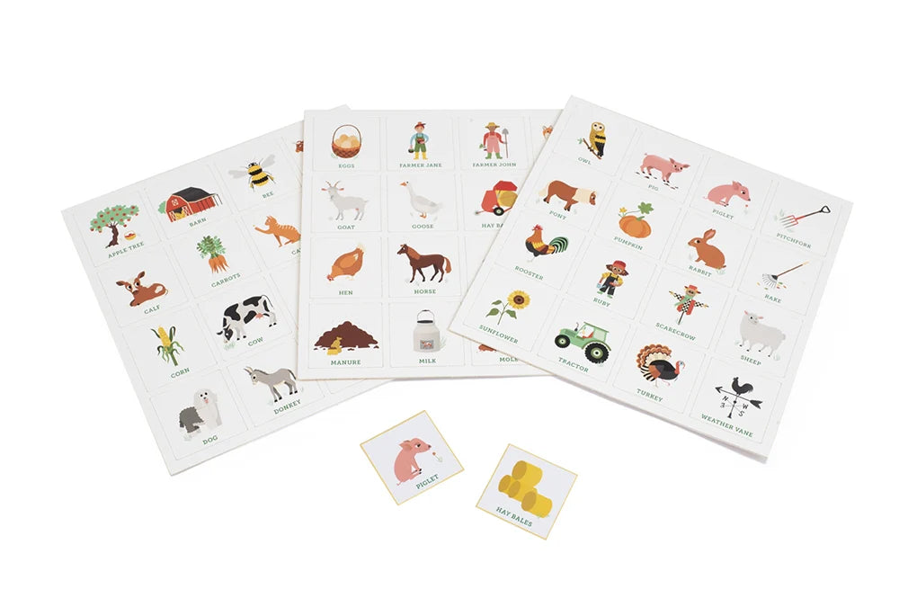 Farm Bingo brings classic bingo fun to the farm! Featuring beautifully illustrated farm animals, crops, and equipment, this game is a family-friendly activity designed for 2-8 players, ages 3+. Kids and adults alike will enjoy spotting their favorite farmyard animals while learning along the way.