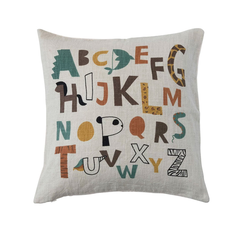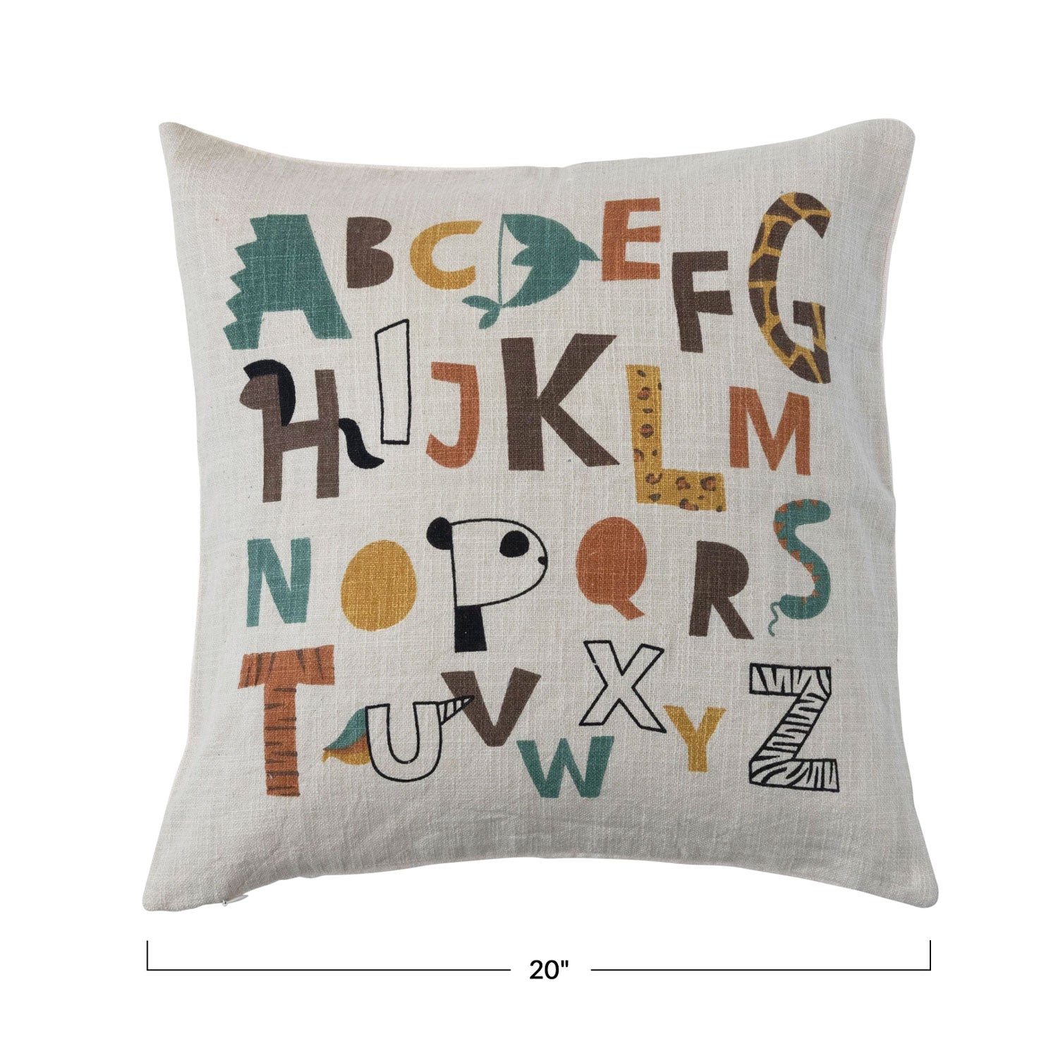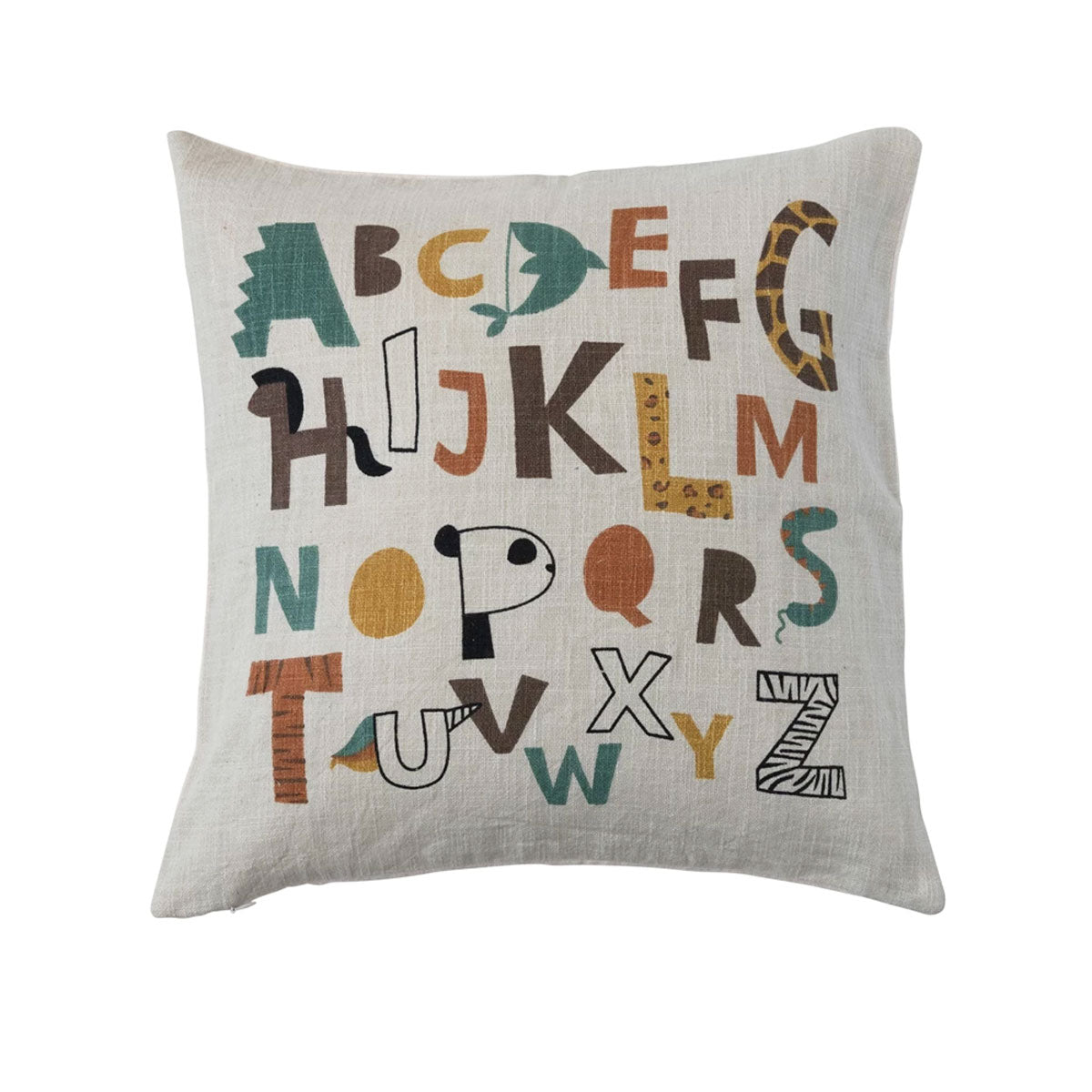 Add some pep to your little one's space with this adorable alphabet pillow, featuring every letter of the alphabet in a fun, animal-themed abstract design.