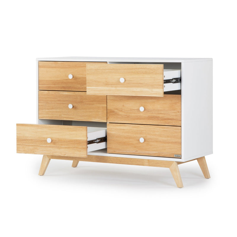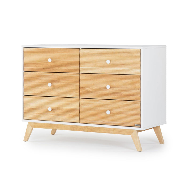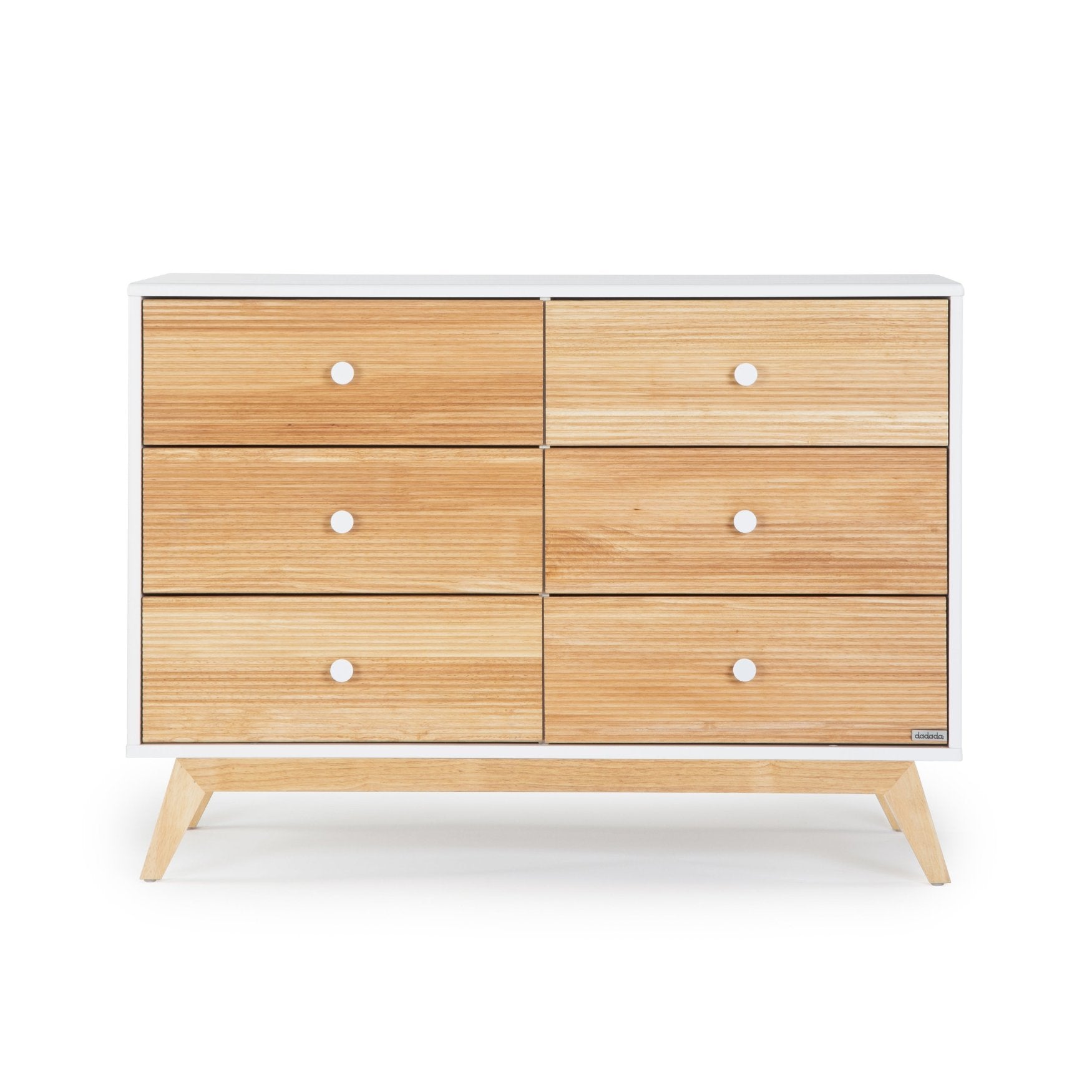 Framed in calmly contrasting white dresser walls, the Merry 6-drawer Dresser is a space-saving, style-elevating asset in the nursery or any room of the house.