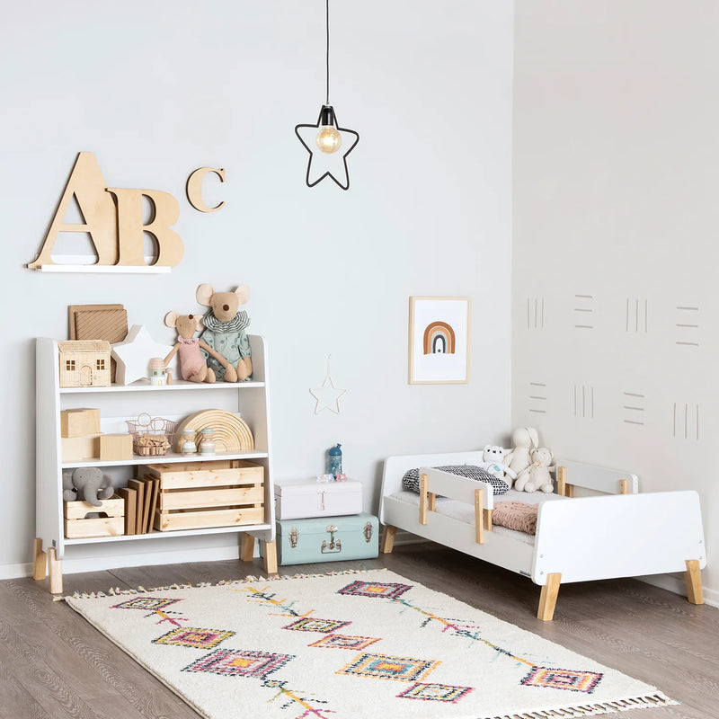 A sturdy bed built just for toddlers with playful curves and modern shapes to smooth the meaningful transition into “a real bed.” The low profile and two removable rails provide a safe and comfortable sleeping place that helps your active toddler easily get in and out of bed. This high-quality bed fits a standard crib mattress and brightens any decor with a pop of modern design.