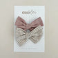 Elevate your look with an Emi Lei Bow Set, featuring a combo of delicate lace and linen. The neutral colorways effortlessly compliment any outfit, making them a versatile and sophisticated addition to your accessory collection. Embrace timeless elegance with a charming set.