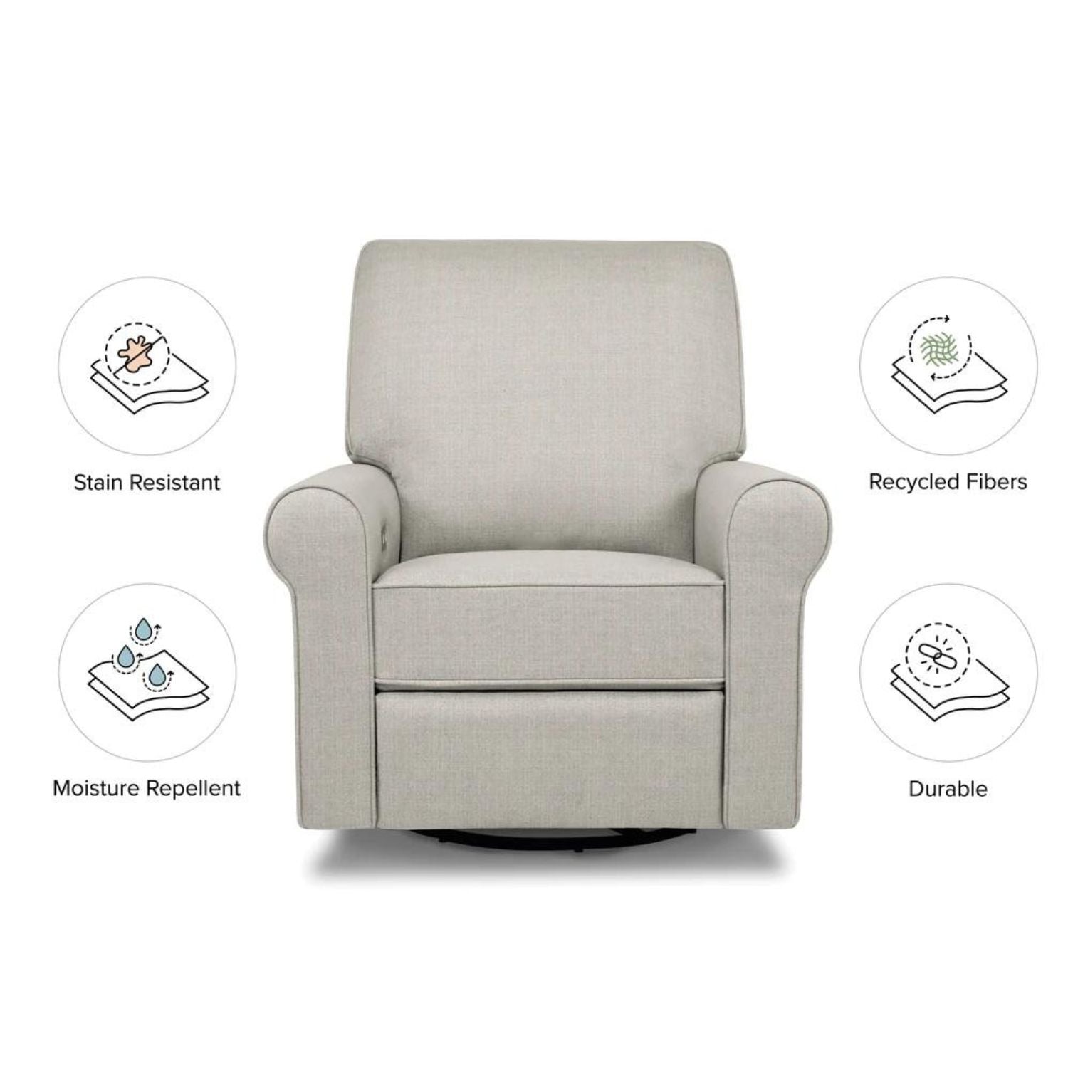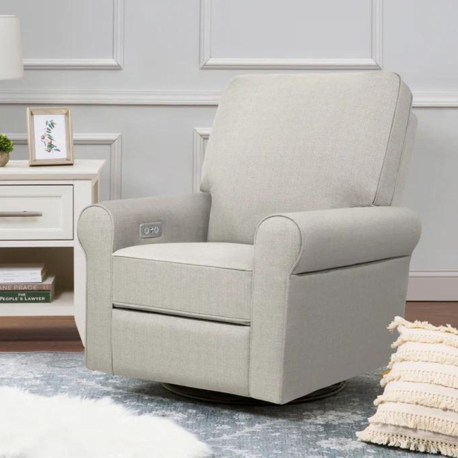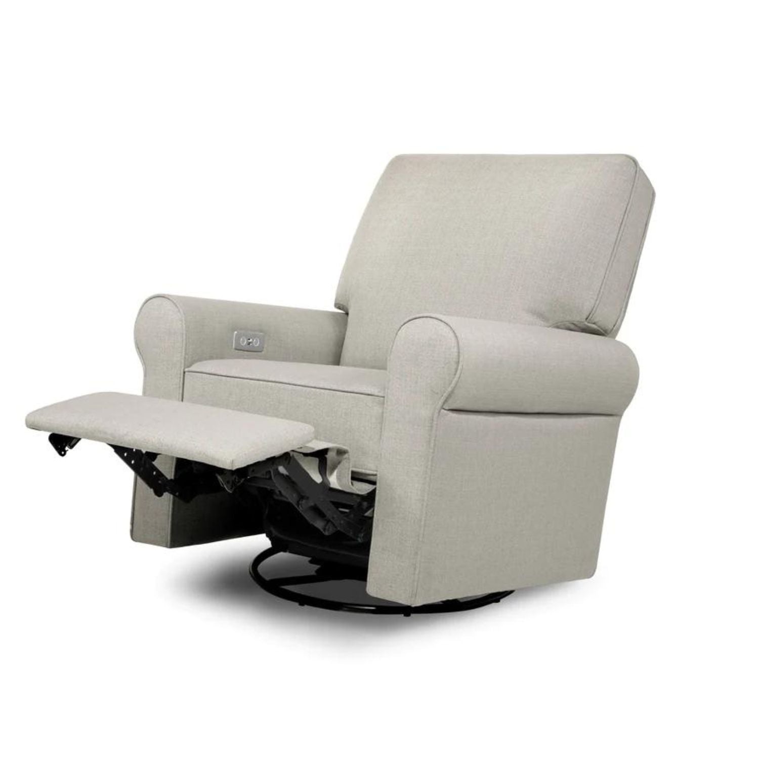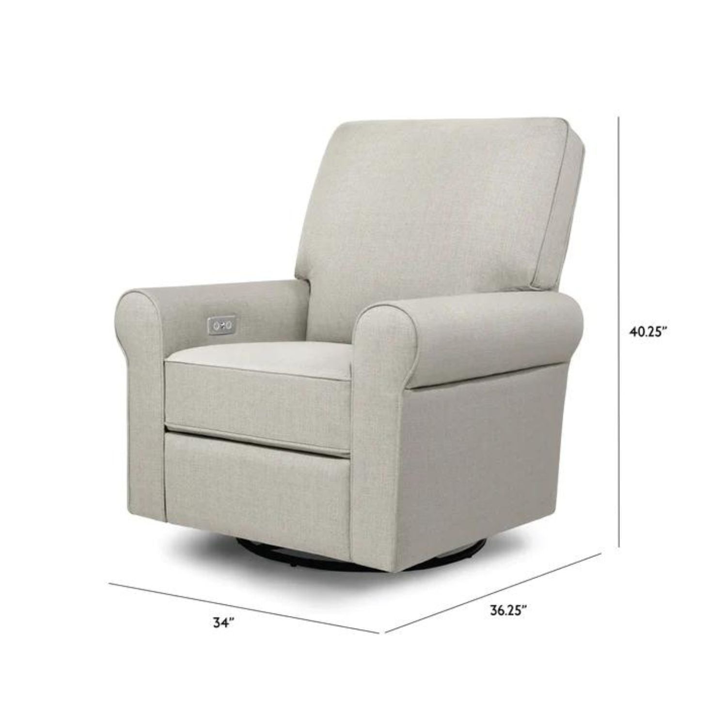 The Monroe Pillowback Power Recliner introduces traditional style with all the comforts of modern technology. With plush arm rests and a soft pillowback, it provides a restful retreat through day and night. With the Monroe's electronic reclining mechanism, built-in USB port, and gentle swivel and gliding motions, you and your baby can relax with comfort and ease.