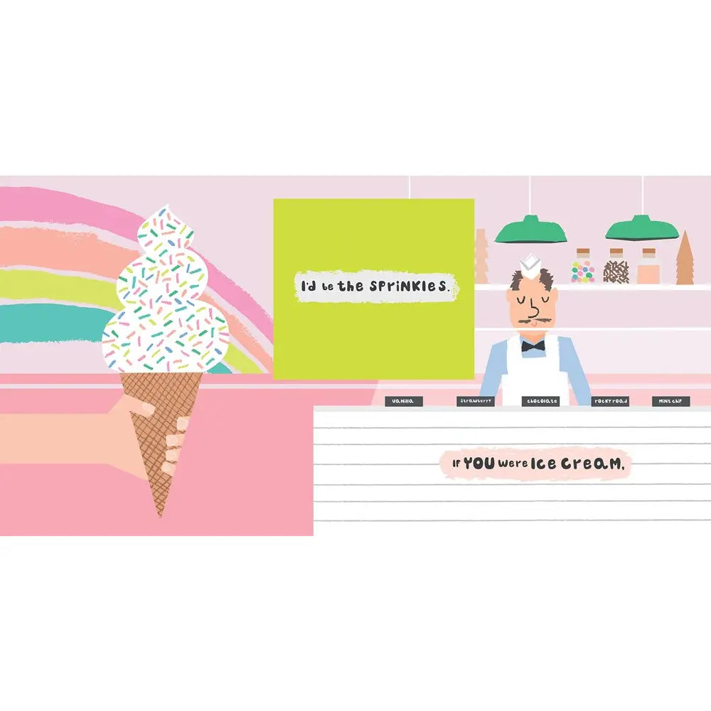 Features playful comparisons like spaghetti & meatballs and ice cream & sprinkles