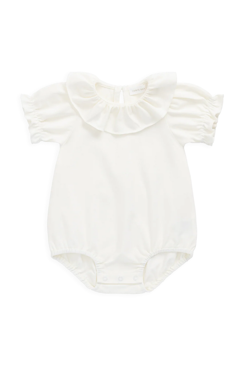 Delicate and timeless, the Livvy Bodysuit in Parchment is a beautifully soft essential made for everyday elegance. With short puff sleeves, a gently gathered silhouette, and a feminine frill collar, it offers a refined look while keeping little ones perfectly comfortable.