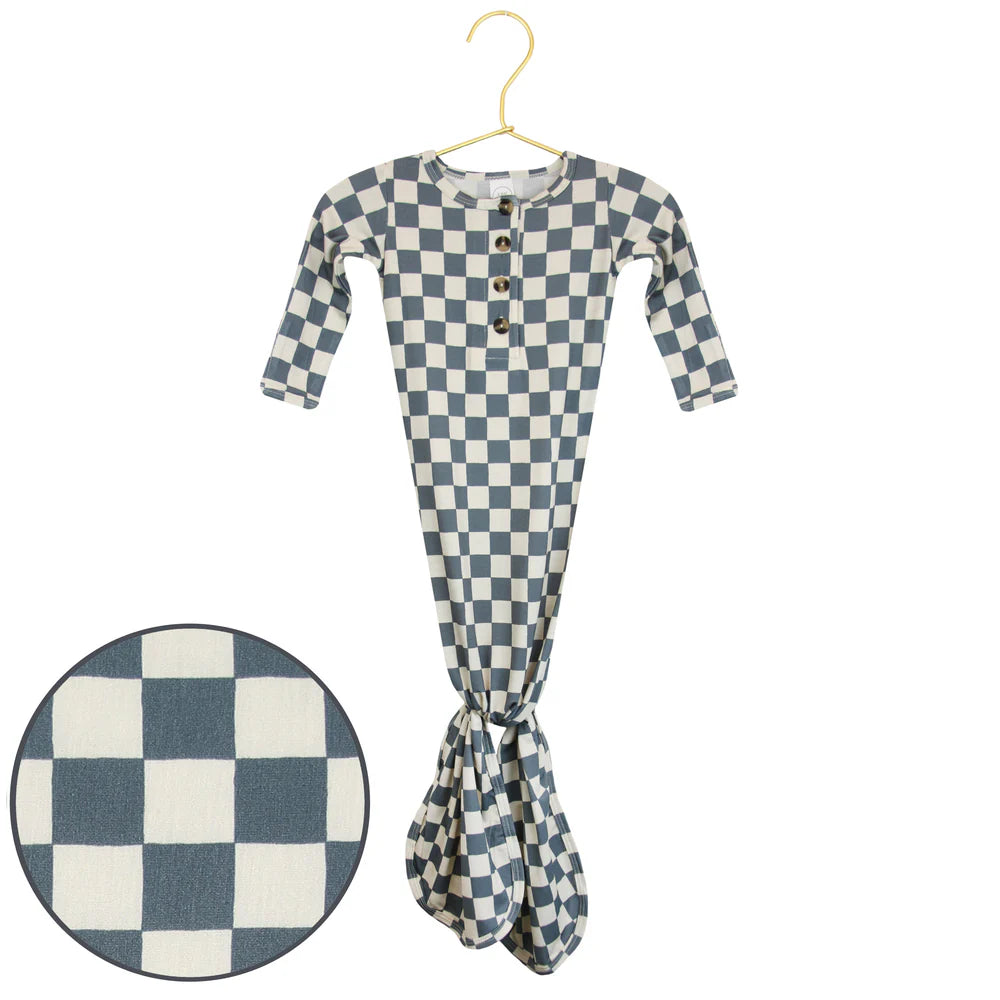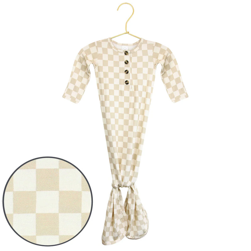 The easiest tie-bottom outfit for day or night. Made for hassle free diaper changes and gentle dressing, this knotted gown is designed with a button-down front and tie bottom for simple closure (no more snaps at 2 am!) Fold over wrist cuffs are the most thoughtful finishing touch.