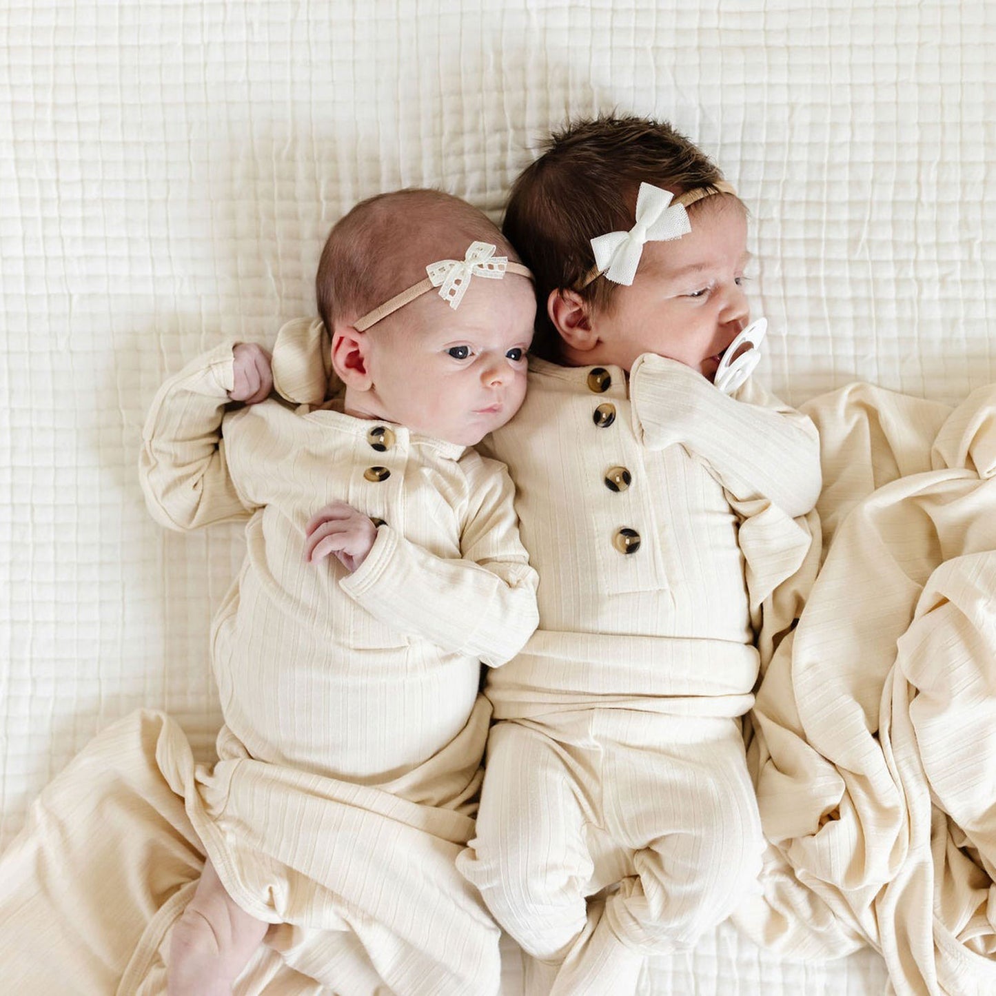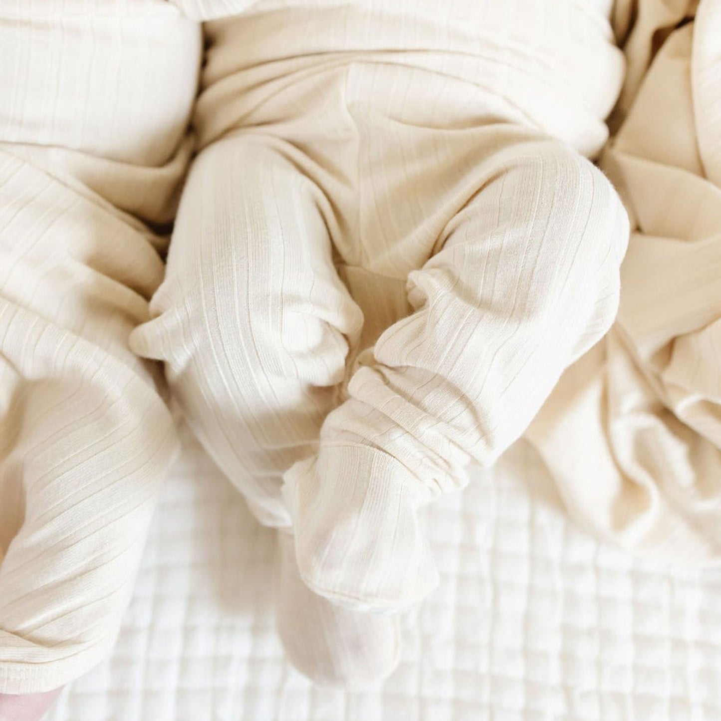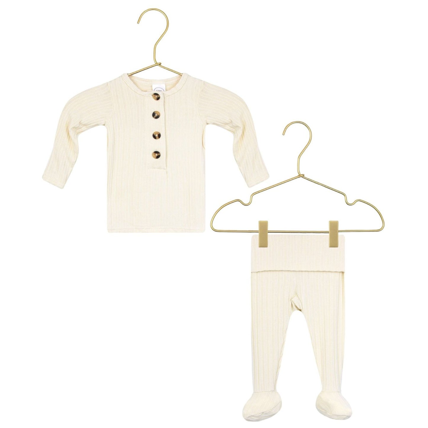 Good things come in pairs and this top + bottoms set is no exception. Made from Lou Lou and Company's signature silky-soft material for a stretchy, comfy fit with functional buttons and fold-over waistband for room to grow (or to wear high-waisted). And say goodbye to socks that slip right off with built-in footies (on the newborn size only) to keep those tiny toes warm without the fuss. Unbelievably sweet mixing & matching approved.