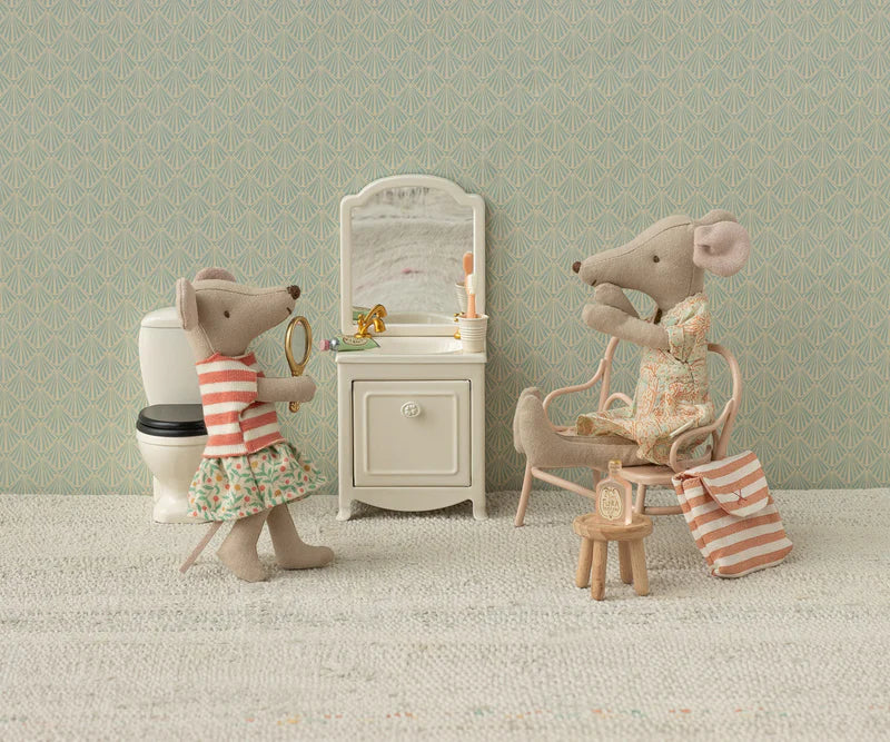 Bedtime routines just got a whole lot cuter! This tiny toiletry set includes all the essentials your Maileg mice need to get ready for bed, tucked neatly into a charming striped bag.