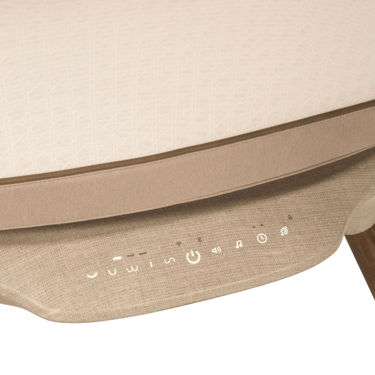 As part of the Maxi-Cosi Kindred Collection, the Starling Smart Bassinet is made with soft, luxe fabrics and tapered Ash wood legs with specially finished metals, offering a sleep space that is both beautiful and comfortable. In addition, the innovative smart features offer a bassinet that helps baby sleep better. When baby cries, the bassinet immediately responds with one of its calming motions to lull baby back to sleep, or five soothing sounds through the built-in Bluetooth speaker, all with customizable timers.