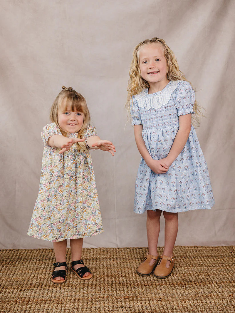 Sunshine, smiles, and little adventures all in one sweet dress. The Summer Meadow Dress features a bright yellow floral print with cheerful pops of color, perfect for warm-weather twirls and special summer days.