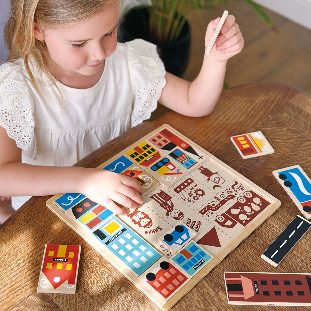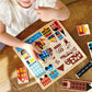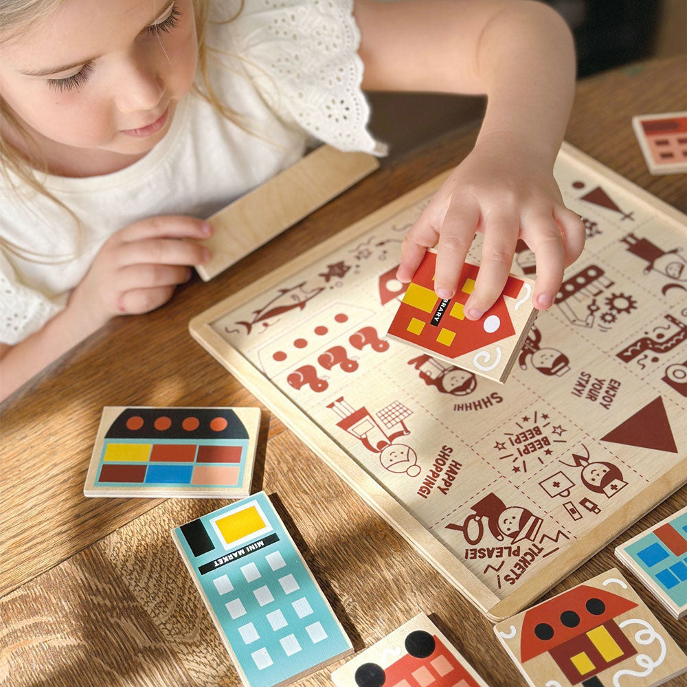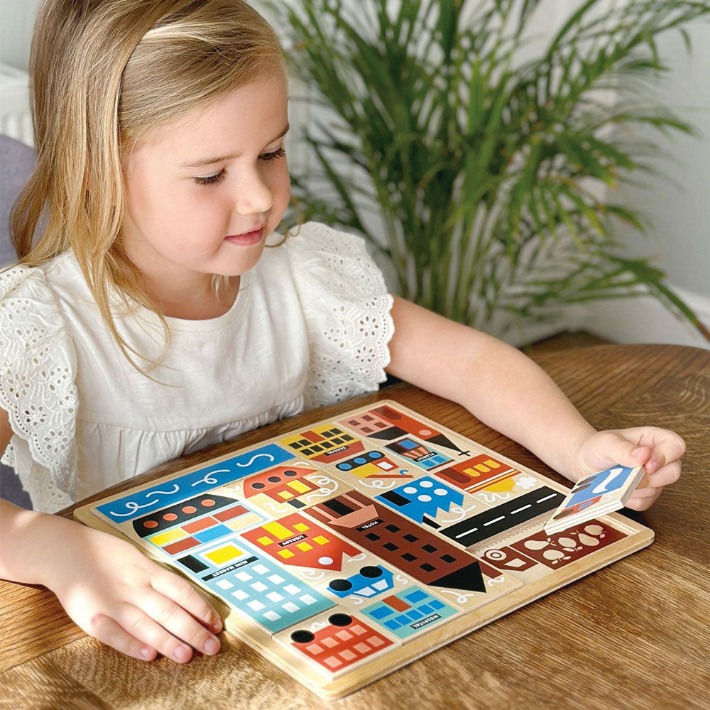 This town themed puzzle comes with 17 removable illustrated pieces that can be matched up to their corresponding imagery.