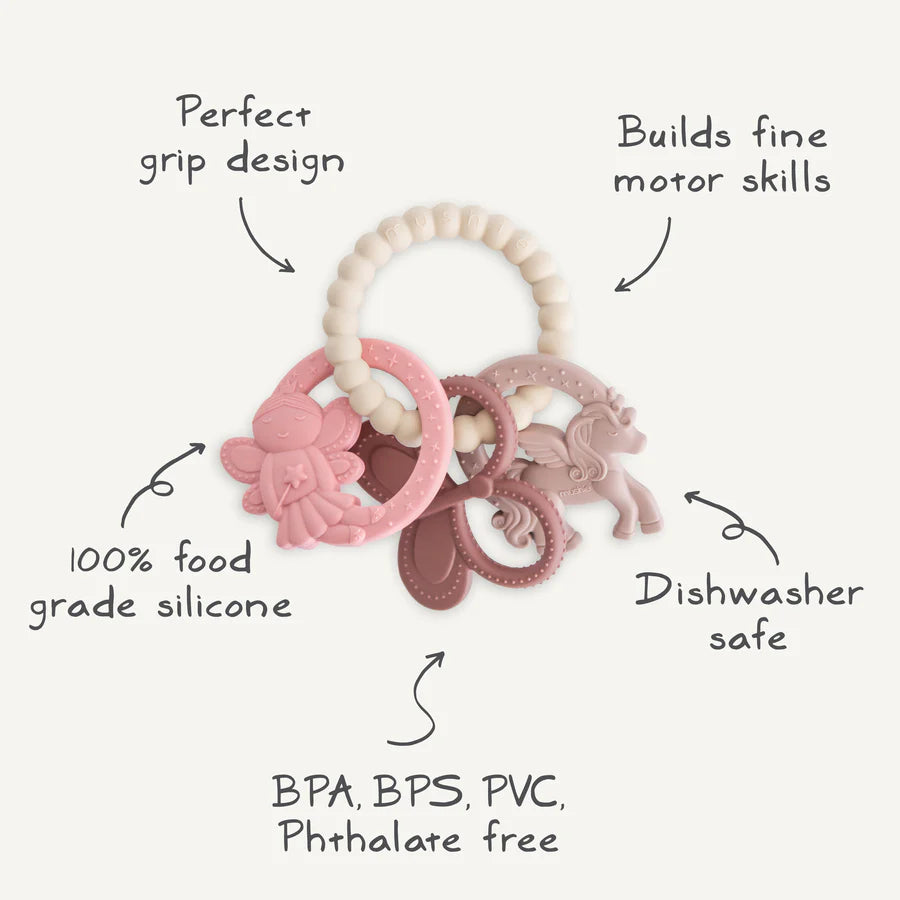Soft, soothing, and thoughtfully designed, the Fairy Teething Ring brings comfort to every stage of teething. With gentle textures and calming colors, it turns everyday moments into a peaceful sensory experience.