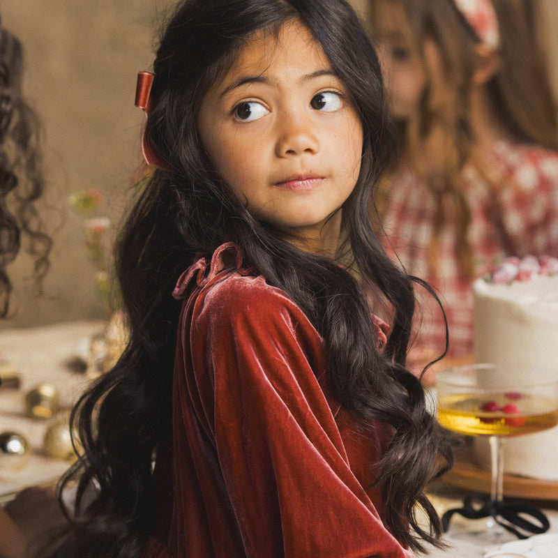 Rich velvet and timeless details make the Adeline Dress a standout for holiday gatherings and special occasions. With its ruffle collar and balloon sleeves, it’s equal parts sweet and sophisticated.