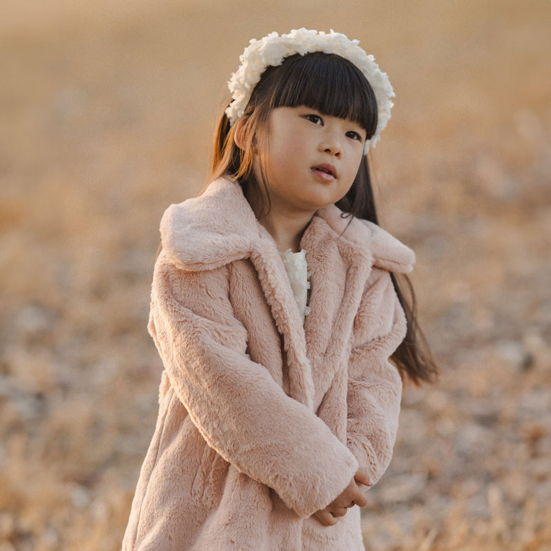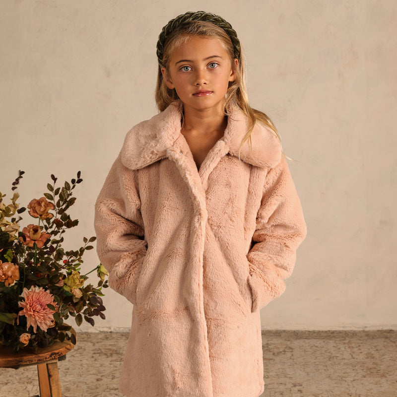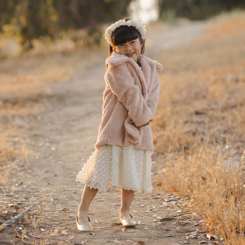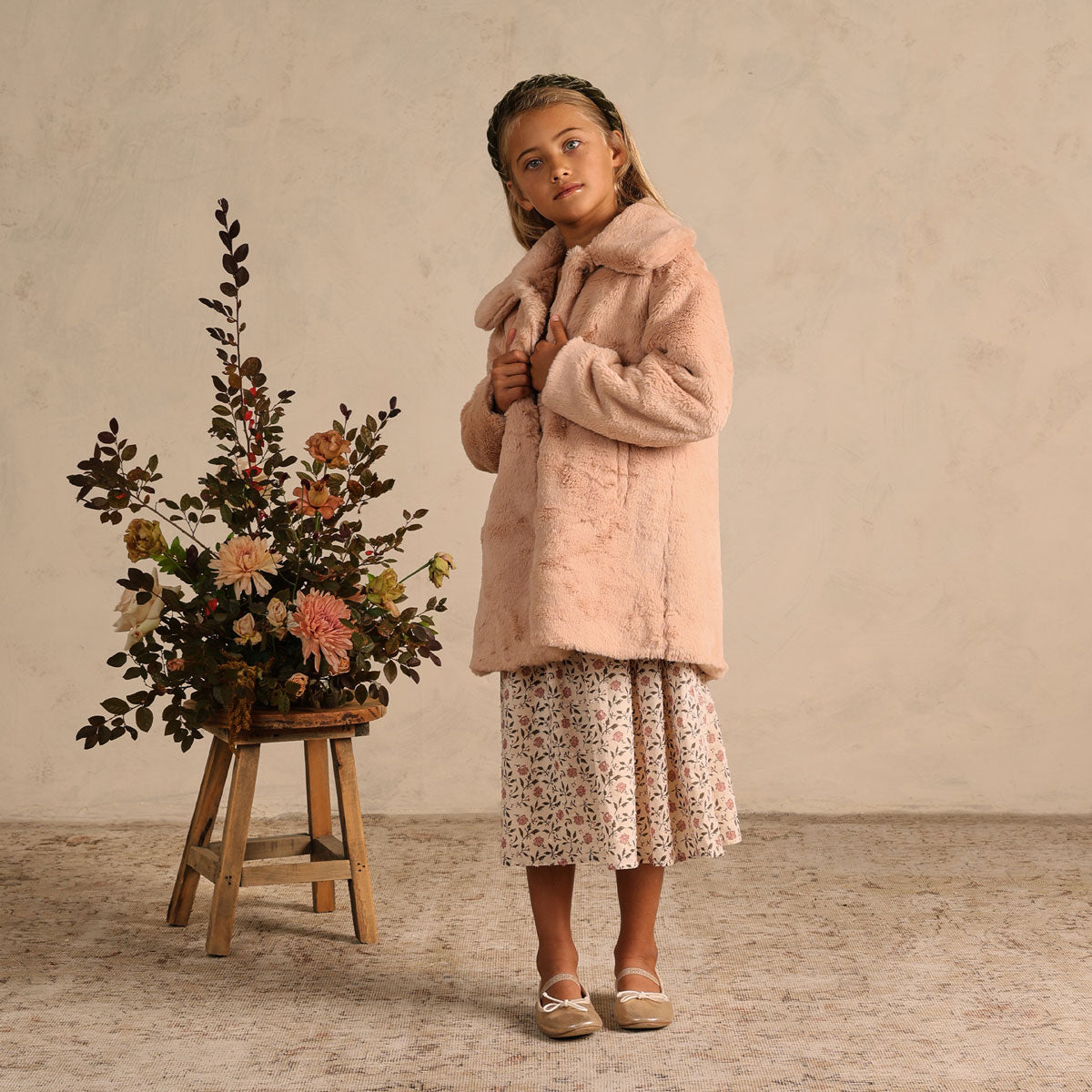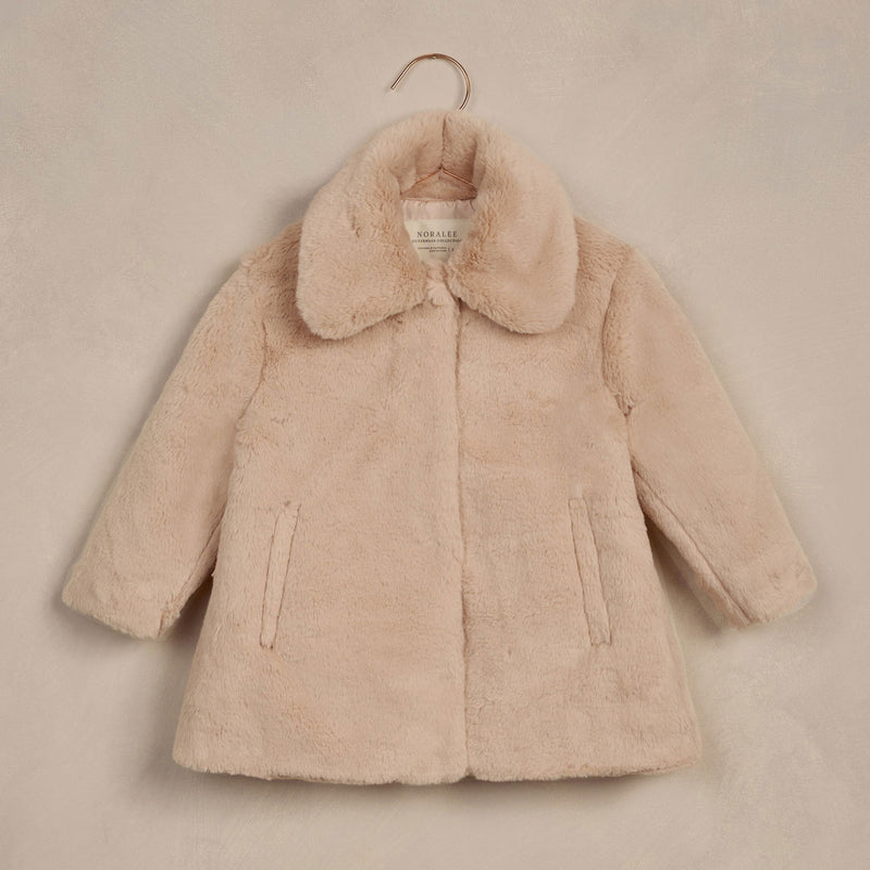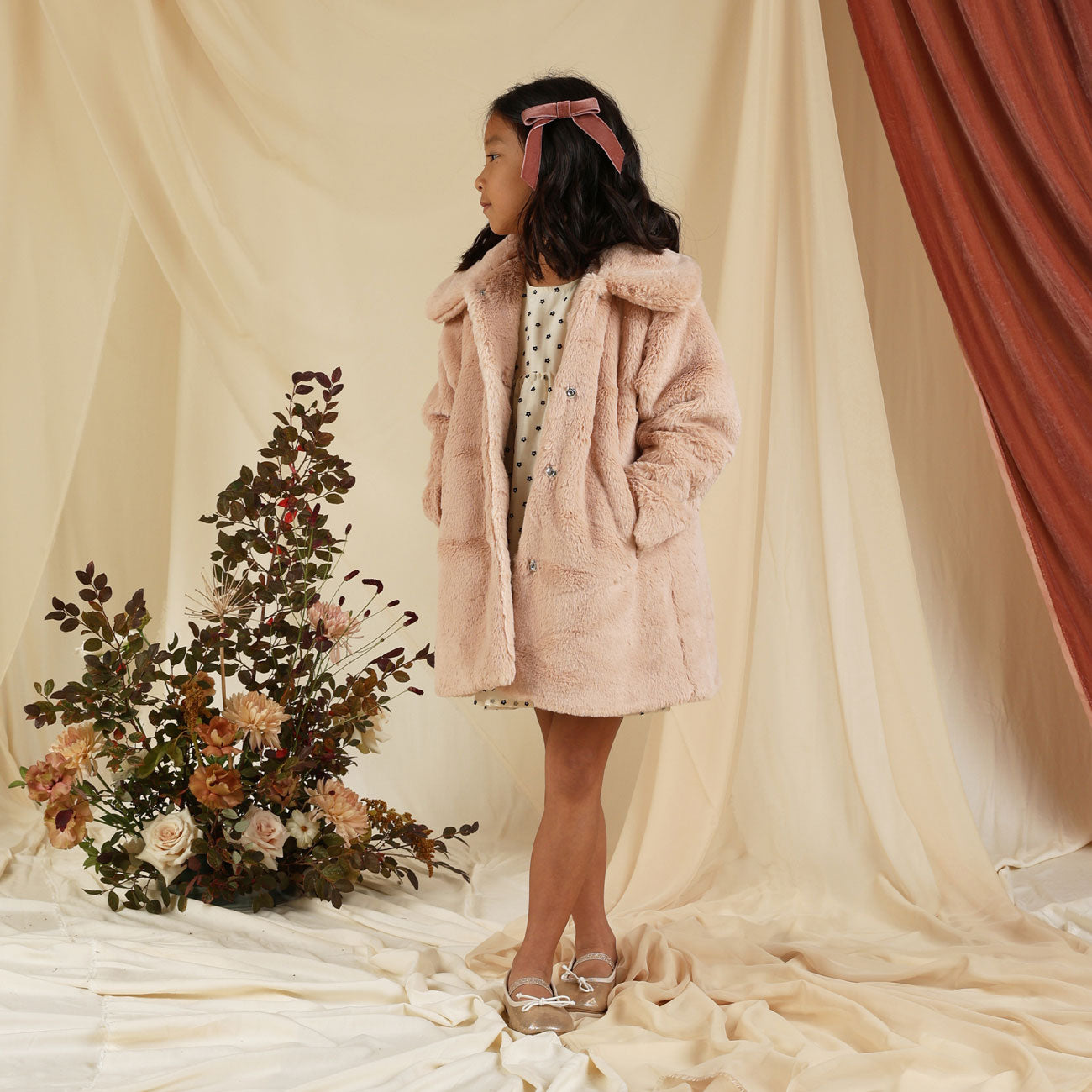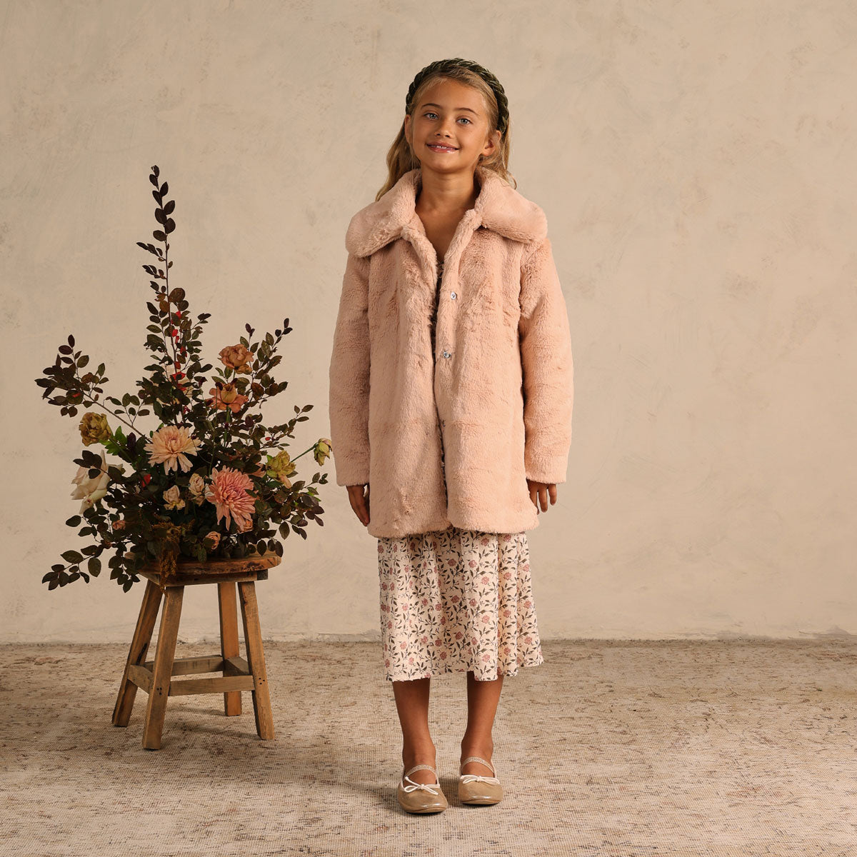 Noralee's new Eloise Coat has hidden snaps along the center front and pockets at the front. With a darling full collar, this slightly oversized cut faux fur coat will keep your little one warm this season.