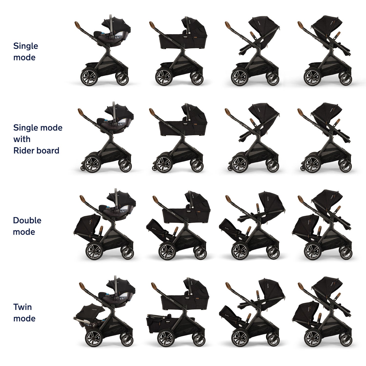 • 25+ modes–convert from a single stroller to a double or twin when using the included Rider Board or Nuna DEMI Next Sibling Seat (sold separately)