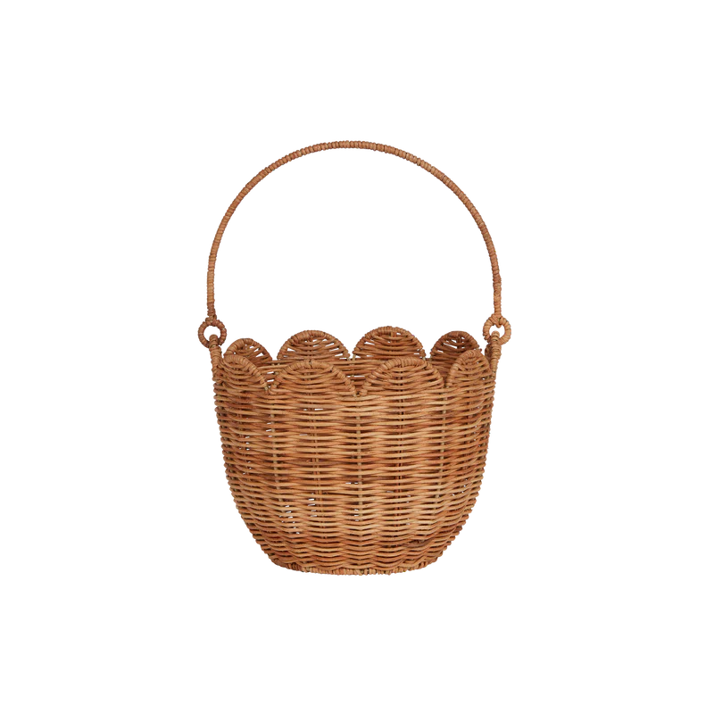 A charming and versatile basket for little hands! The Rattan Tulip Carry Basket features a whimsical scalloped edge and a sturdy handle, perfect for toting essentials, toys, and treasures in and out of the home. Handwoven with natural rattan over a durable metal base, this lightweight basket is both decorative and functional.