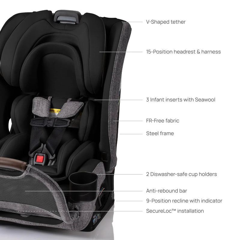 - Five crash safety systems working together — IsoEnergy™ crash energy management, anti-rebound bar, V-shaped top tether, steel frame, and a 5-point harness combine to reduce force transferred to your child in a collision