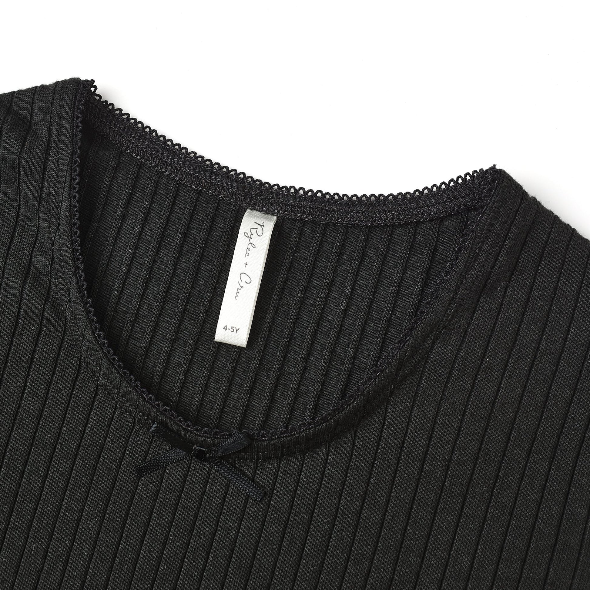 Chic and versatile, this ribbed long sleeve top is finished with a delicate lettuce-edge hem, lace-trimmed neckline, and a sweet satin bow. A timeless piece that pairs effortlessly with any look.