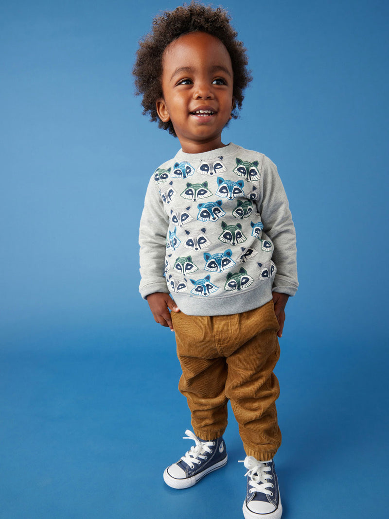 Cute raccoon faces march across this popover. Easy fit for all day comfort.